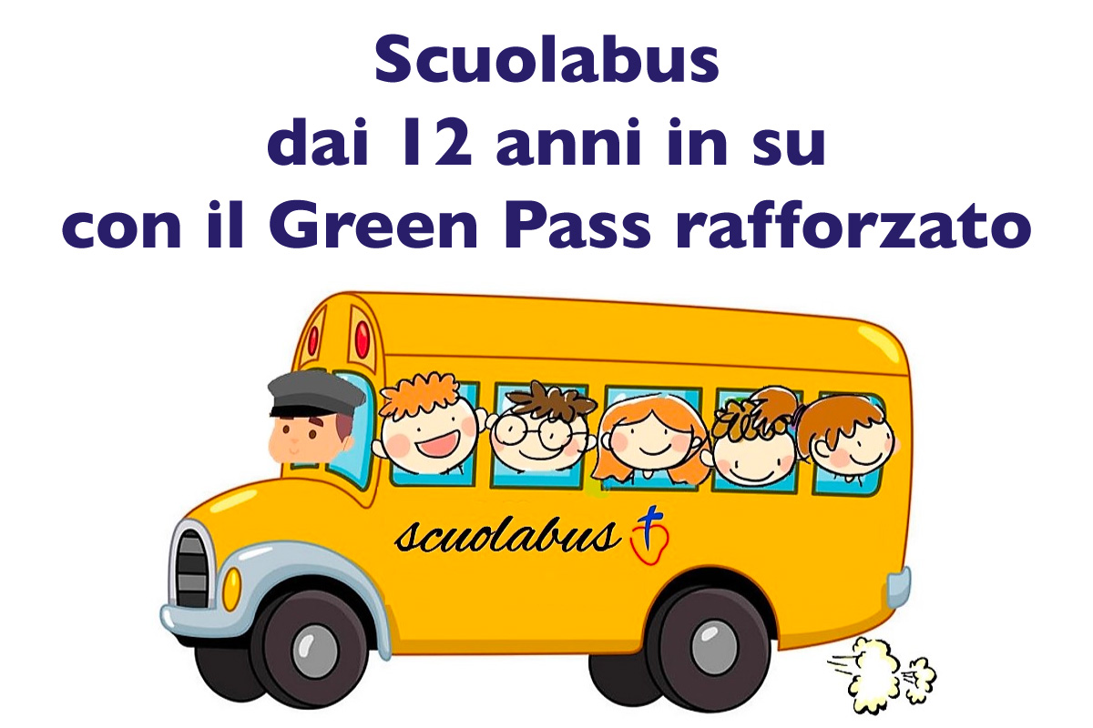 Dal lunedì 10 gennaio, in ottemperanza agli ultimi provvedimenti governativi in materia di emergenza epidemiologica da covid-19, gli alunni dai 12 anni compiuti che usufruiscono del servizio di Scuolabus, dovranno essere in possesso del Green Pass Rafforzato (vaccinazione o guarigione da Covid-19).
