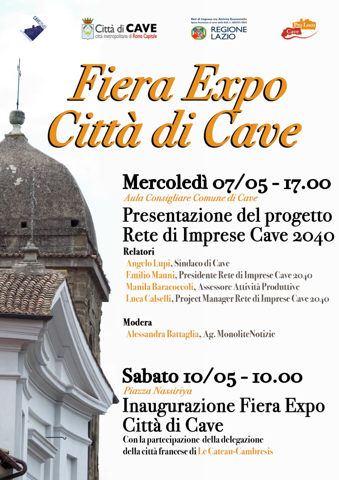 - Sabato 10 Maggio, ore 10.00 in Piazza Nassirya: inaugurazione della Fiera Expo Città di Cave, alla presenza della delegazione francese di Le Cateau-Cambresis.